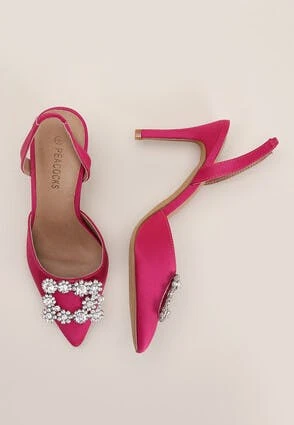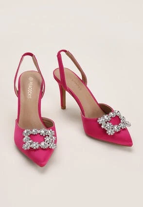 Classic court shoes with a twist. These deep pink satin finish shoes are ideal for evenings out. With a pointed toe and a mid-height stiletto heel, these timeless shoes have an added rectangle sparkly embellishment and are perfect for both smart and casual occasions.