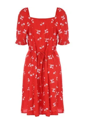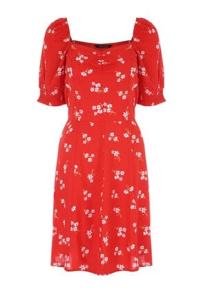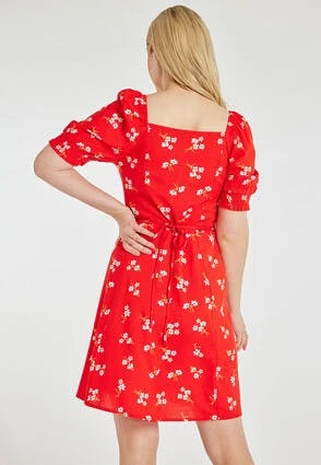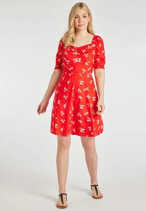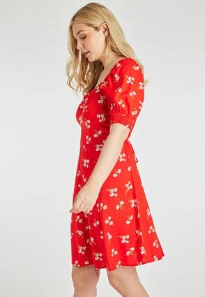 This stunning tea dress will make the perfect addition to your new season wardrobe. It features flattering longer-length short sleeves with shirred cuffs, a ruched sweetheart neckline, and a pretty all-over floral print in red, white and hints of yellow.