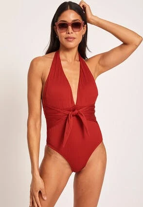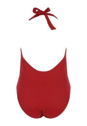 This gorgeous Swimsuit will make a great addition to your Swimwear collection. Crafted from a dark red ribbed fabric, this one piece swimsuit features a plunge halterneck and a flattering tie front design. It’s perfect for lounging at the pool or a day out on the beach!
