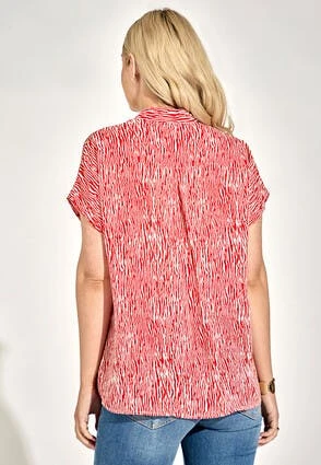 This beautiful women’s shirt will make the perfect addition to your new season wardrobe. In a lightweight fabric it features short sleeves, a button up shirt neckline, front flap pockets and an all-over red zebra print, on a white background.