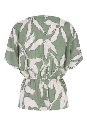 Update your collection of everyday tops with this fun blouse. In a sage green fabric with a bold white leaf print design, short angel sleeves, a v-neckline and tie waist detailing, it can be worn with the matching culottes or a pair of your favourite jeans.