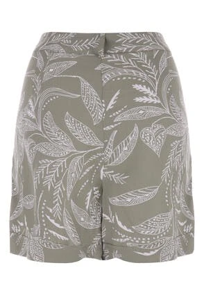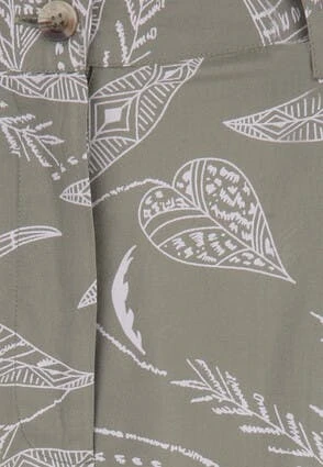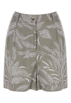 These lovely womens shorts will make a great addition to your new season collection. In sage green with a leaf design, they feature a zip and button fastening. With a loose fit on the legs these versatile shorts can be worn in many different ways, from smart wear, to a beach cover-up.