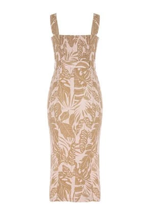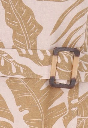 This gorgeous pencil dress in stone with an all over leaf print will make the perfect addition to your Summer wardrobe. In a linen blend, it features a square neckline, shoulder straps plus a flattering waist cinching belt.