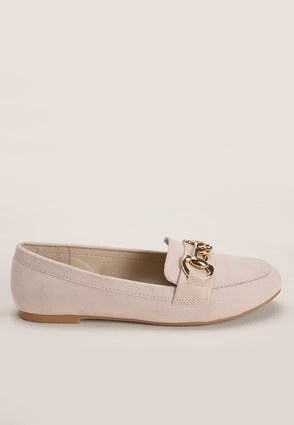 Update your footwear collection with these stylish slip-on loafers. In a stone suedette finish with a chunky gold chain detail, these are a great shoe to add to almost any outfit for a smart casual look.