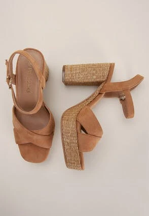 Update your footwear with these tan platform sandals. Featuring a buckle fastening in tan faux suede, a matching crossover lower toe strap, the straw weave platform completes the look.