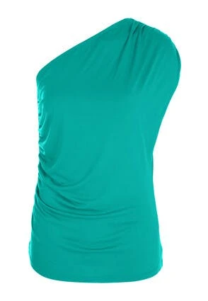Stay on trend with this one shoulder top. Style it with ease with it’s gathered side and shoulder. This sleeveless teal grecian draped top can be worn with a skirt and heels, or dressed down with your favourite jeans.