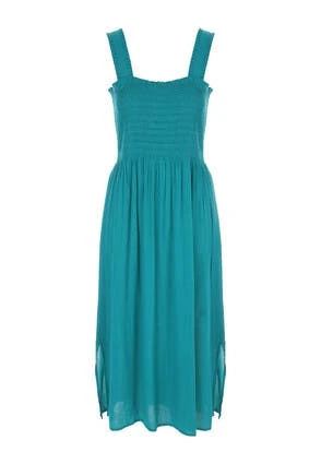 Update your collection of dresses with this teal midi dress. Featuring a strappy design with an elasticated shirred top section and loose fitting skirt, it is a stylish essential for your new season wardrobe.