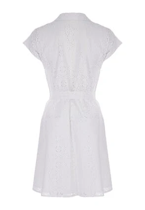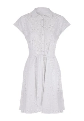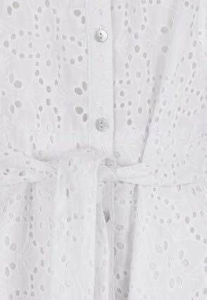 Update your new season wardrobe with this lovely sunny shirt dress with pretty broderie lace detailing throughout. This womens dress in white features short capped sleeves, and shirt collar with white buttons. Pair it with heels and a bag for an effortless summer outfit.