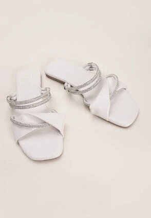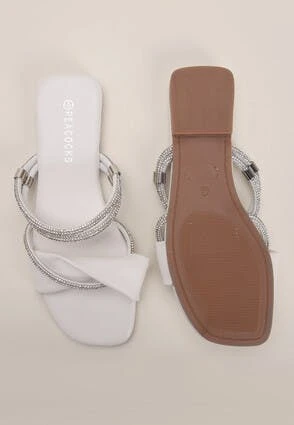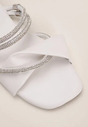 Add some glitz to your footwear with these white diamante sandals. Featuring a white sole with double diamante straps across the ankle and a white and diamante strap across the toes. With a flat sole, they are ideal to jazz up a summer outfit this season.