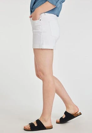 These casual mid length denim shorts will make a versatile addition to your summer wardrobe. In white denim with front and back pockets and a rolled hem. They’re easily dressed up or down for any occasion.