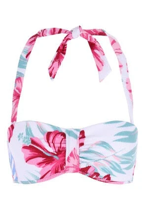 Add some style to your Swimwear collection whist feeling amazing with this moulded White tropical leaf print bikini top. Featuring ruched detailing on the bust, tie halterneck straps and a snap back opening.