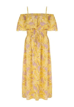 & white palm leaf design featuring an cold shoulder neck line with two small straps and a midi length skirt. Pair with sandals and a bag for a stylish summer look.